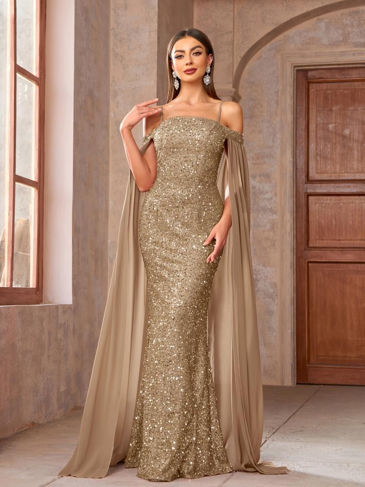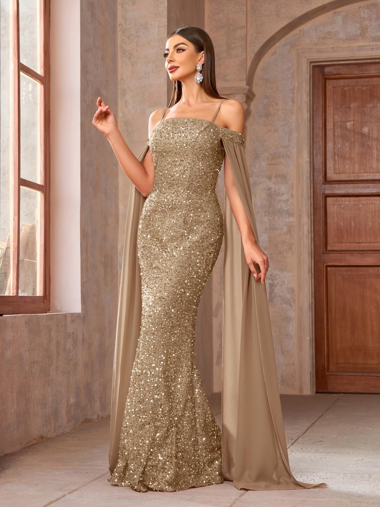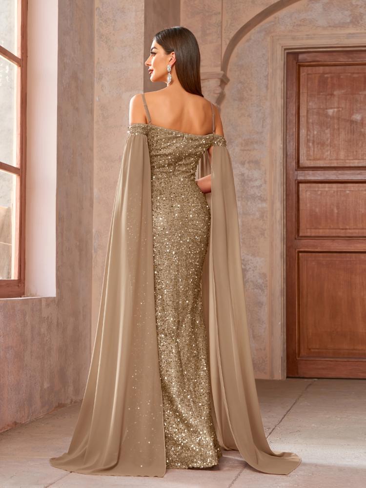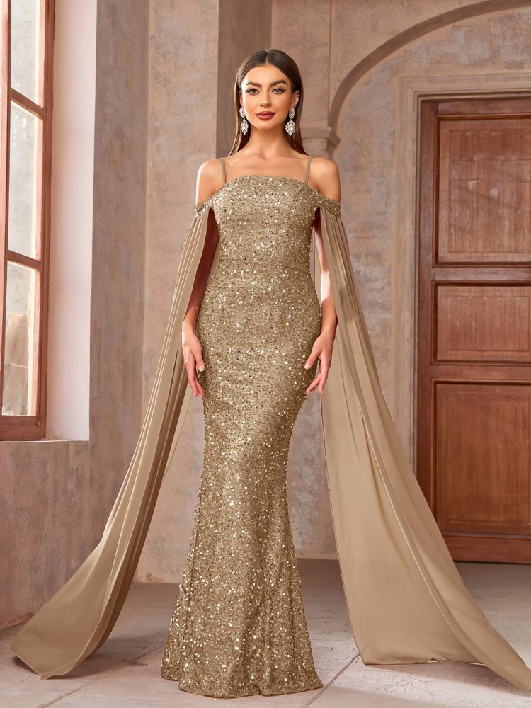 فستان طويل أنيق باللون البيج للنساء، يتميز بأكمام متدلية تضيف لمسة فاخرة وأنيقة. تصميمه الراقي يجعله مثاليًا لحفلات الزفاف، الولائم، والأحداث الرسمية، مع تفاصيل لامعة تزيد من فخامة الإطلالة.